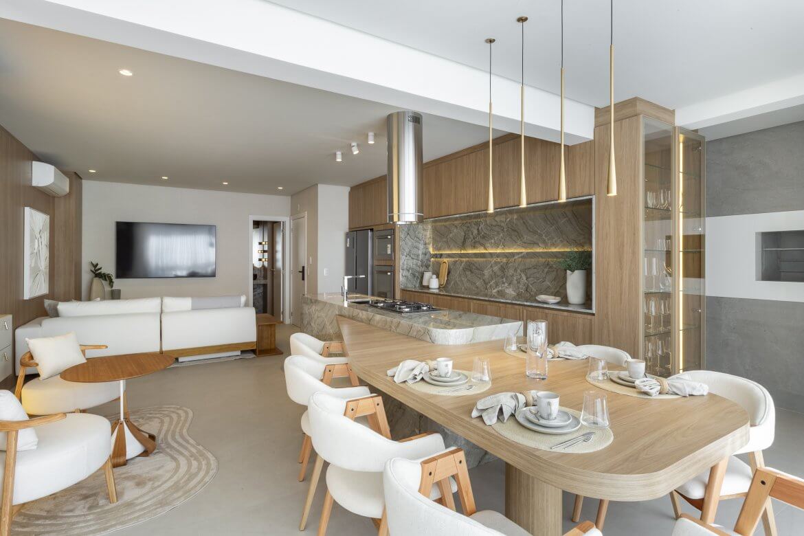 Uma das modificações realizadas foi a integração da sacada ao living, criando um ambiente ainda mais amplo, fluido e convidativo — perfeito para receber ou simplesmente aproveitar os momentos em casa. Cada escolha do decorado reflete a harmonia entre elegância, funcionalidade e conforto. Um exemplo disso é a pedra escolhida para a bancada da cozinha: o Quartzito Gabbana Polido, que combina sofisticação e resistência, valorizando ainda mais o ambiente.