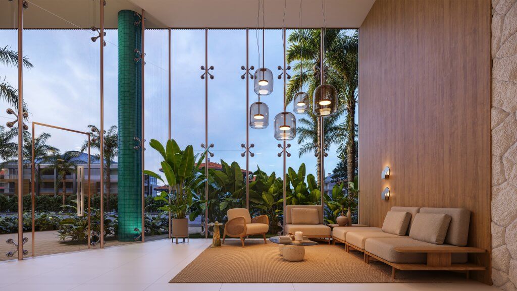 O porte-cochère organiza a chegada com fluidez, sendo o primeiro empreendimento no Balneário Rincão com essa facilitação de acesso.