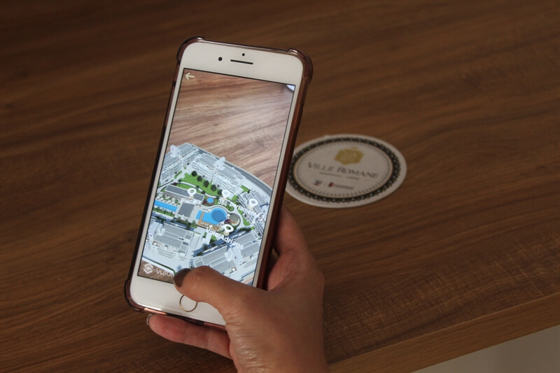 Mais uma possibilidade tecnológica que a construtora oferece aos seus clientes é a realidade aumentada. A ferramenta virtual está disponível para o Residencial Ville Romane. Para ter acesso, é necessário baixar o aplicativo do Ville Romane no celular e, em seguida, direcionar a câmera do aparelho para uma bolacha de chope criada especialmente para o empreendimento. A bolacha contém o código que é lido pelo app e que, uma vez acionado, libera a visualização em 3D.